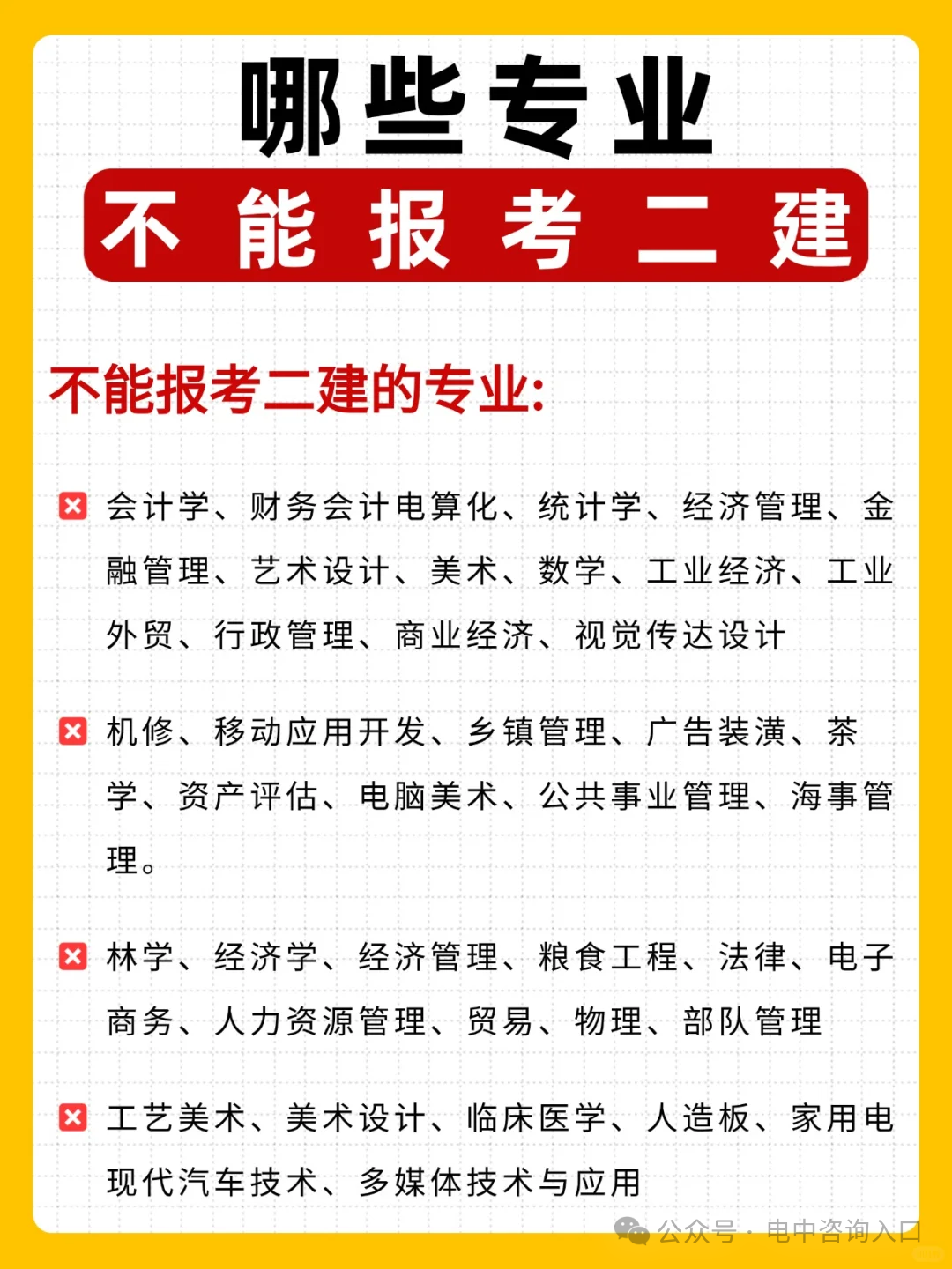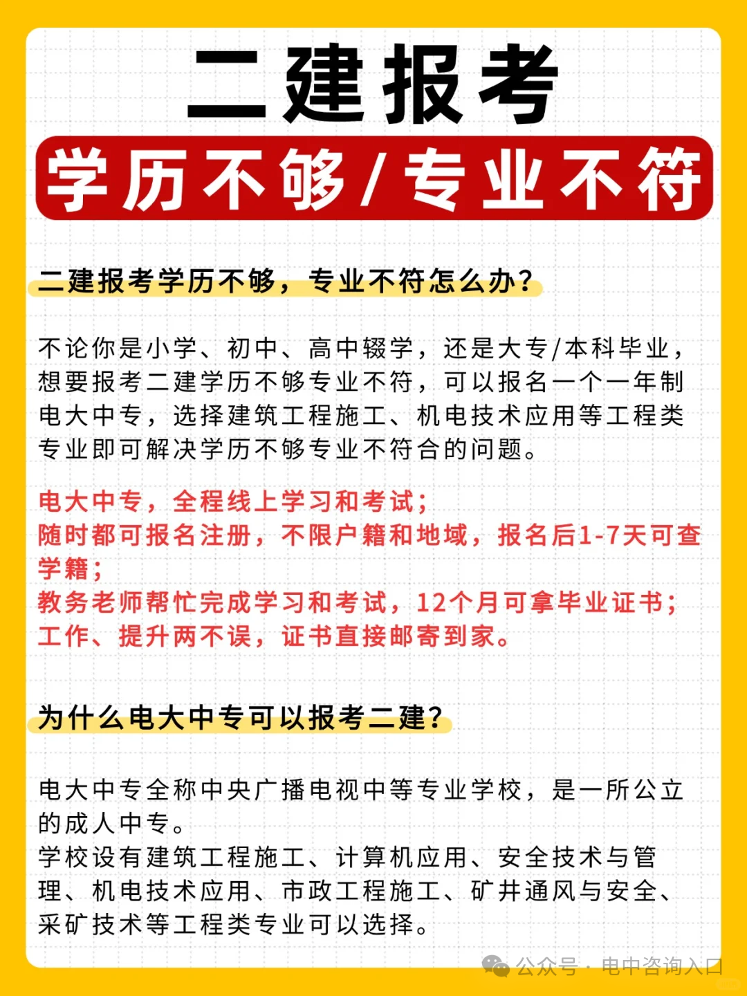 中专及以上学历,工程类及工程经济类专业,从事相关工作满两年。 ✅ 可报考二建的专业范围 根据住建部规定,二建报考需满足工程类或工程经济类专业,或部分省份认可的相近专业,具体分类如下 1⃣ 工程类/工程经济类专业(直接可报) 工学类:土木工程、建筑工程、建筑学、机械设计、电气工程、给排水、测绘工程、水利水电工程等 工程经济类:工程管理、工程造价、建筑经济管理、房地产经营与管理等 其他相关:交通工程、矿业工程、市政工程、环境工程、安全工程等 2⃣ 部分省份开放“相近专业”报考 例如:计算机应用、物流管理、化学工程、园林设计、自动化、电子信息等 注意:江苏、云南、浙江等省份明确放宽专业限制(需搭配更长工作年限) ❌ 不可报考的专业类型(常见例子) 文科类:汉语言文学、英语、法学、历史学等 艺术类:美术、音乐、舞蹈、播音主持等 医学类:临床医学、护理学、药学等 理学类:数学、物理、化学(非工程方向) 其他无关专业:金融学、市场营销、旅游管理、教育学等 ⭕1. 学历、专业不符?电大中专来补! 电大中专一年制,年满18周岁即可报名,不限户籍和地域,选择建筑工程施工等工程类专业,12个月课毕业拿证,同事解决二建报考学历不够、专业部付的问题 ⭕2. 工作年限不够?电大中专也能算! 电大中专属于成人中专,工作年限是自动累计的,毕业就可以报考了! ⭕3. 电大中专的优势 时间短:1年即可毕业,拿证速度快。 费用低:相比其他学历提升方式,电大中专性价比更高,只要一千多。 灵活学习:全程线上学习,不影响工作和生活以上是关于中专学历的相关内容,考生可以作为参考,如有学历、报名、条件、时间、专业、院校、费用等问题,可以扫下方二维码免费咨询老师。